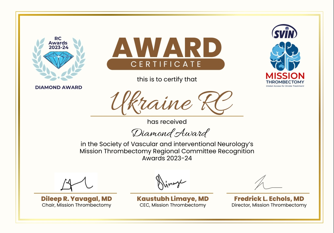 Ukraine has been awarded the prestigious "Diamond Recognition Award" at the SVIN Mission Thrombectomy Regional Awards for 2023-24. This award recognizes outstanding achievements in significantly increasing the availability of thrombectomy in the respective region over the past year.